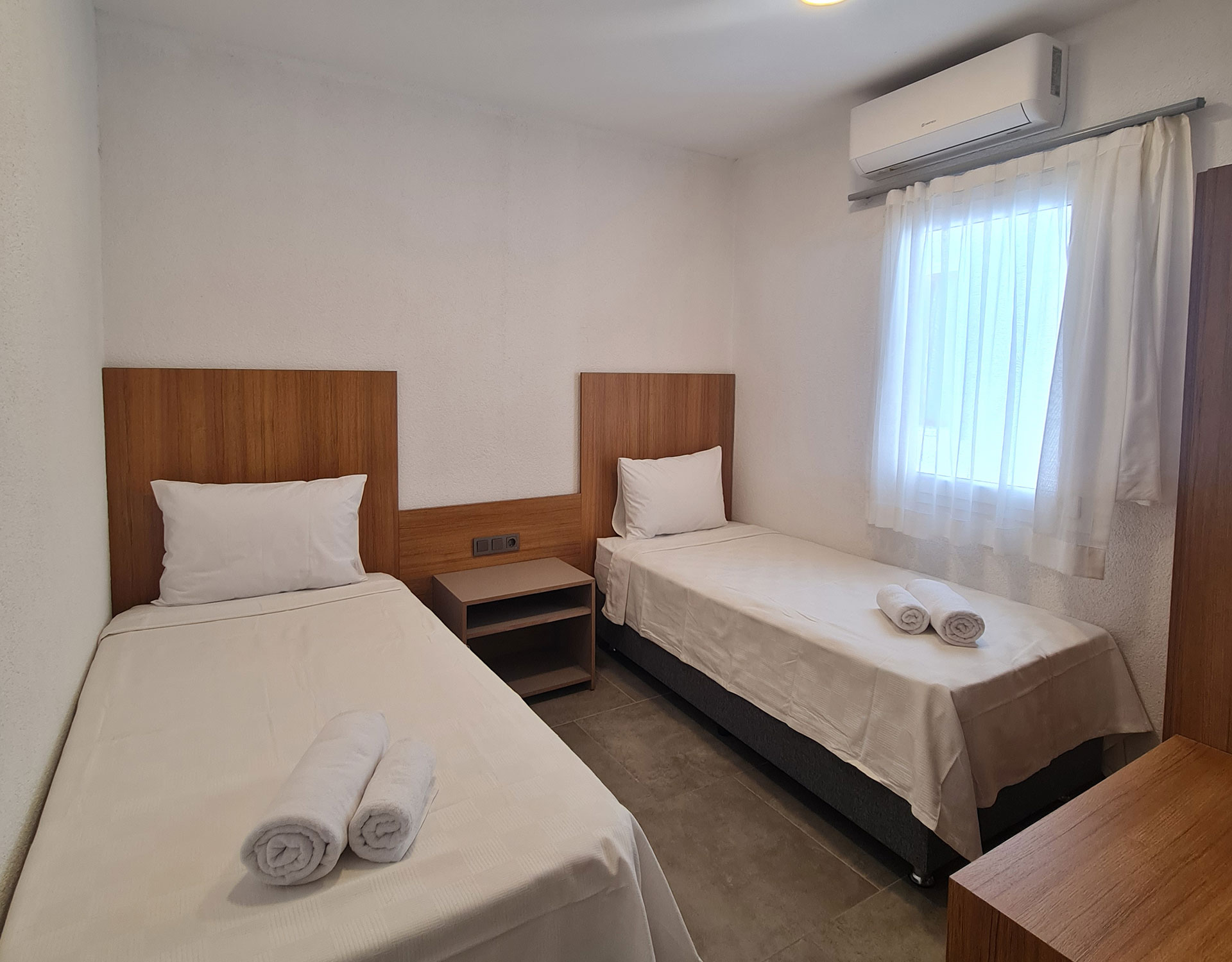 Oda, iki kişilik kapasiteye sahiptir ve iki tekli yatak, özellikle ayrı yatak tercih eden misafirler için uygundur.Yatak: 2 adet tekli yatak